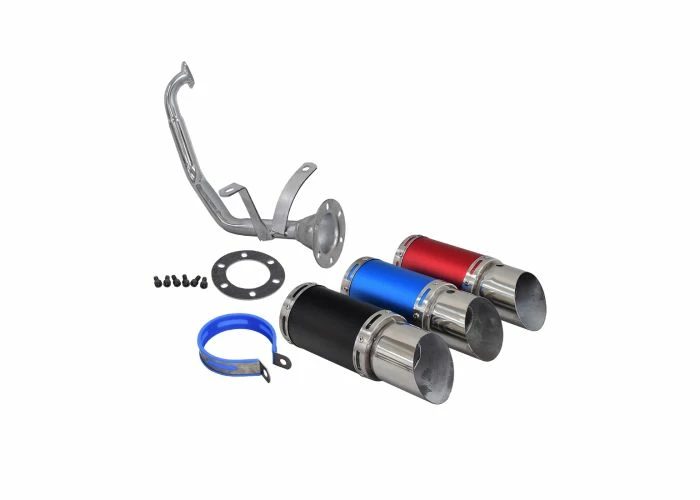 Our short performance exhaust system for GY6 150cc Scooters & Go-Karts includes the muffler, the pipe, gasket, clamp, and the mounting hardware